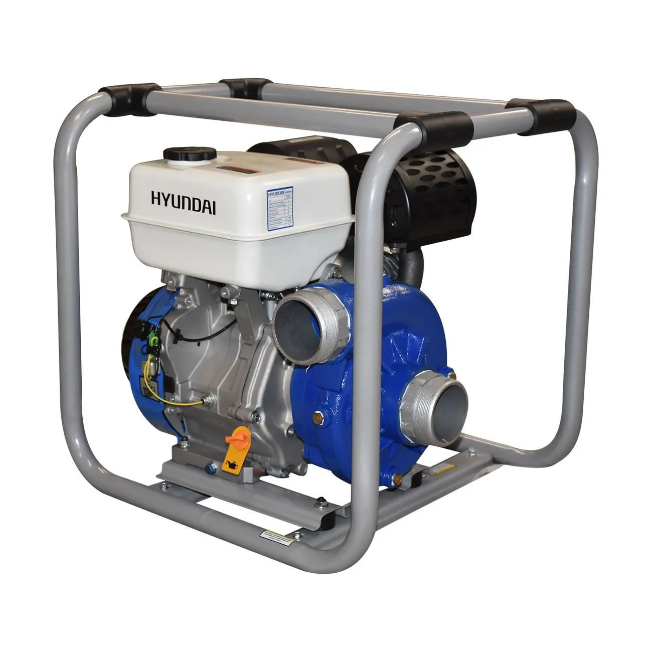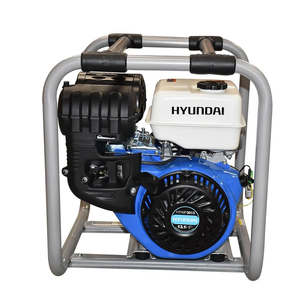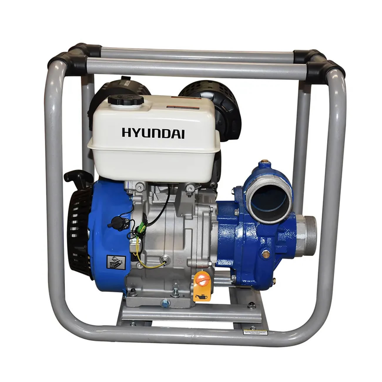 Motobomba centrífuga de alta presión 3x3" con motor de 4 tiempos a gasolina marca HYUNDAI. Ideales para aspersores agrícolas, riegos por micro aspersión, irrigación de campo, cultivos de huertos. Incluye check. Base reforzada, incluye gaucho de plástico.